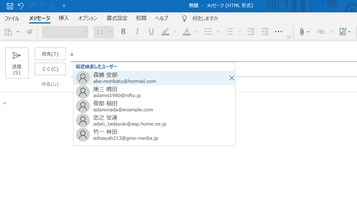 メールアドレスの頭文字のアルファベットだけじゃなく、名前の頭文字の漢字でオートコンプリートさせたいところです。これは、連絡先をインポートする際に一工夫が必要です。