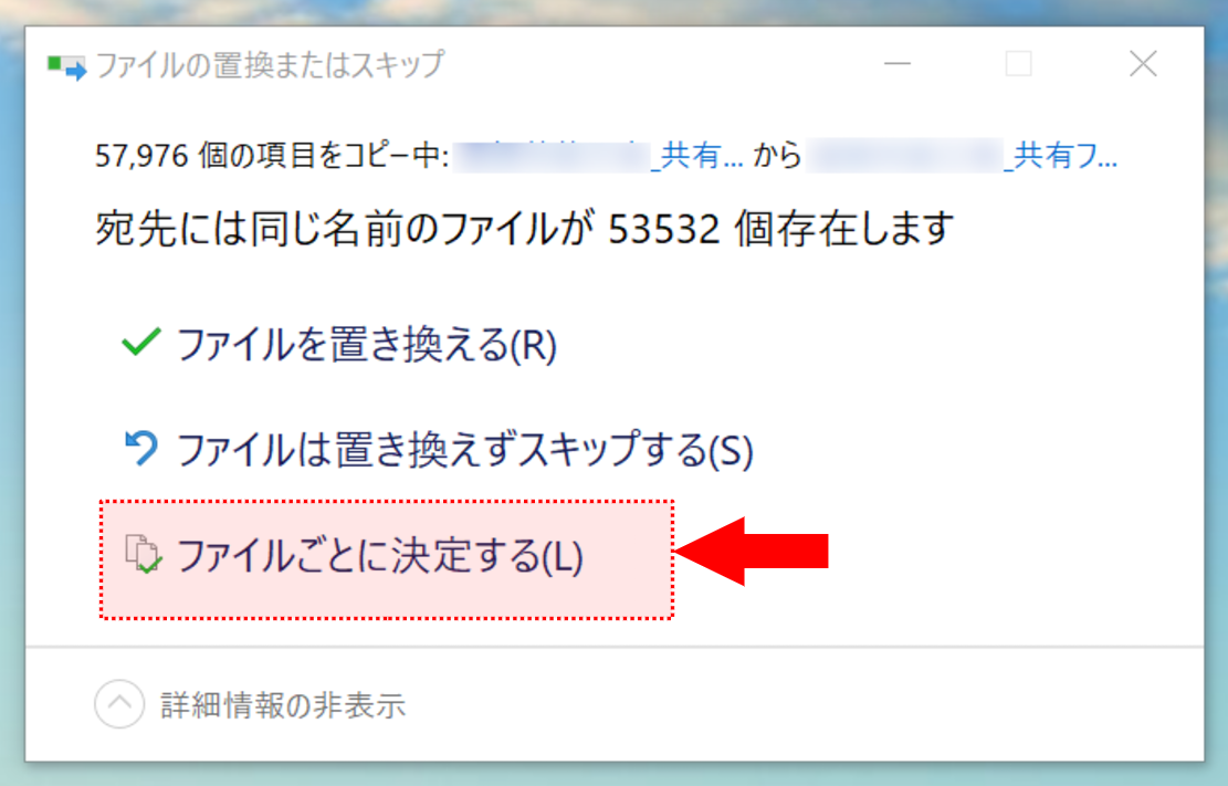 (2021/01/31追記)コピーするファイル数とデータ量が膨大な場合は、「宛先には同じ名前のファイルが〇〇個存在します。」と出ますので、”ファイルごとに決定する“⇒”日付とサイズが同じファイルをスキップする” を選んだ方がコピーも早いし、その後のOneDrive同期も早かったです。