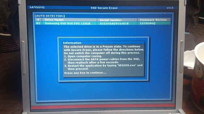 windows8以降はSSDがFrozen stateになっているためSecure Eraseがかけられないとメッセージが出ます。対処方法は一旦SSDの電源を抜き差ししてから、再度実行するように説明が英語で出ています。
