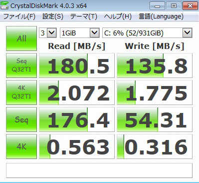 HDD交換後のCrystalDiskMarkのテスト結果がコチラ。