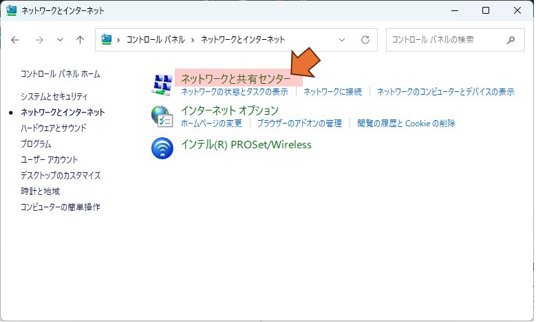 - 次に 「ネットワークと共有センター」 を選ぶ
