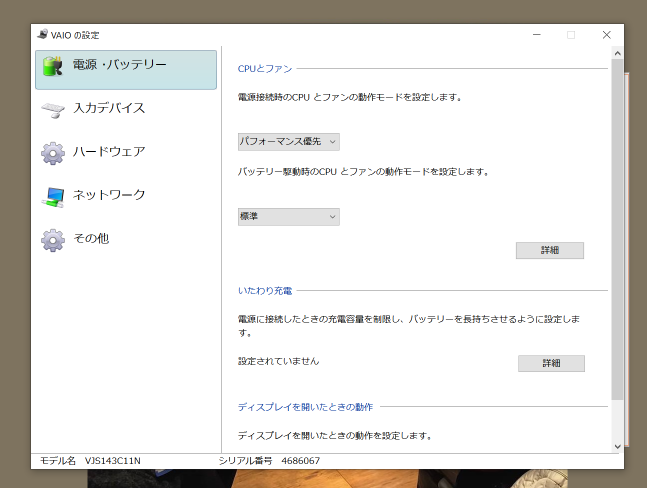 ストアアプリである「VAIOの設定」アプリも自動でインストールされていました。カスタマイズモデルVAIOの付属ソフトはこの「VAIOの設定」くらいなので(Microsoft Officeを除けば)リカバリーメディアを作っておく必要もないくらいクリーンインストールで十分かもしれません。