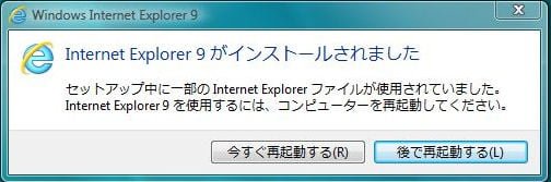 IE9の日本語版をマイクロソフトサイトからダウンロードしてインストールしたときは、下記のパターンが出たらIE9が英語版になっています。Windowsアップデート経由でインストールした場合は、いつの間にか英語版になっています。