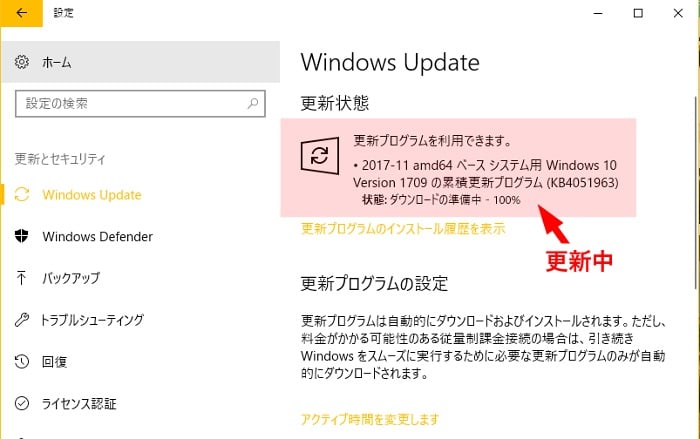 Window10の場合は、 スタートメニュー→ 設定→ 更新とセキュリティ→Windows Update の画面を開いたままにします。