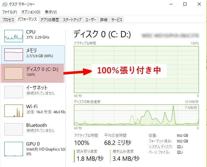 タスクマネージャーが開いたら詳細表示にして、パフォーマンス タブのディスクの項目を開いたままにします。ここが使用率100%のまま下がらない状態になっているのを確認します。