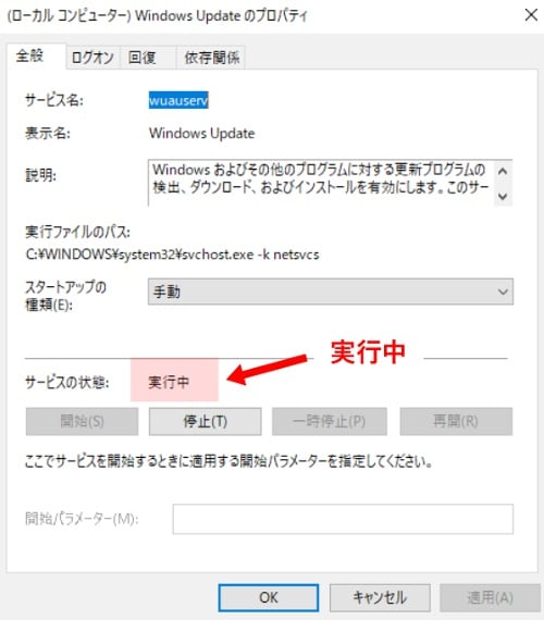 Windows Updateサービスの画面で、スタートアップ種類の設定のプルダウンメニューから「無効」を選択します。その下のサービスの状態の「停止」をクリックして、Windows Updateサービスを一時停止した状態にします。