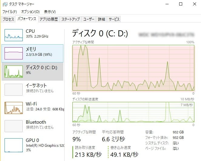 あとは、インストールが最後まで完了するかどうか、しばらく待ちます。HDDの使用率が一時的に100%近くに上がりますが、上辺のほうでギザギザのグラフを描いていれば大丈夫です。