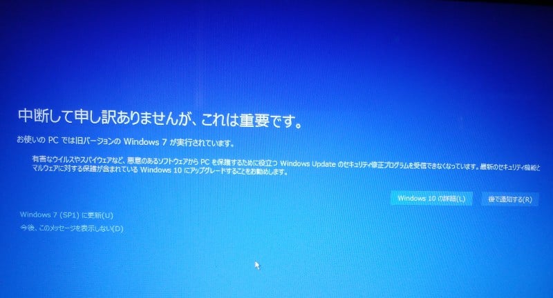 このあと、ブルーの全画面表示でWindows7 SP1に更新するか、Windows10にアップグレードを推奨してくれる KB3163589 もこの中に含まれています。