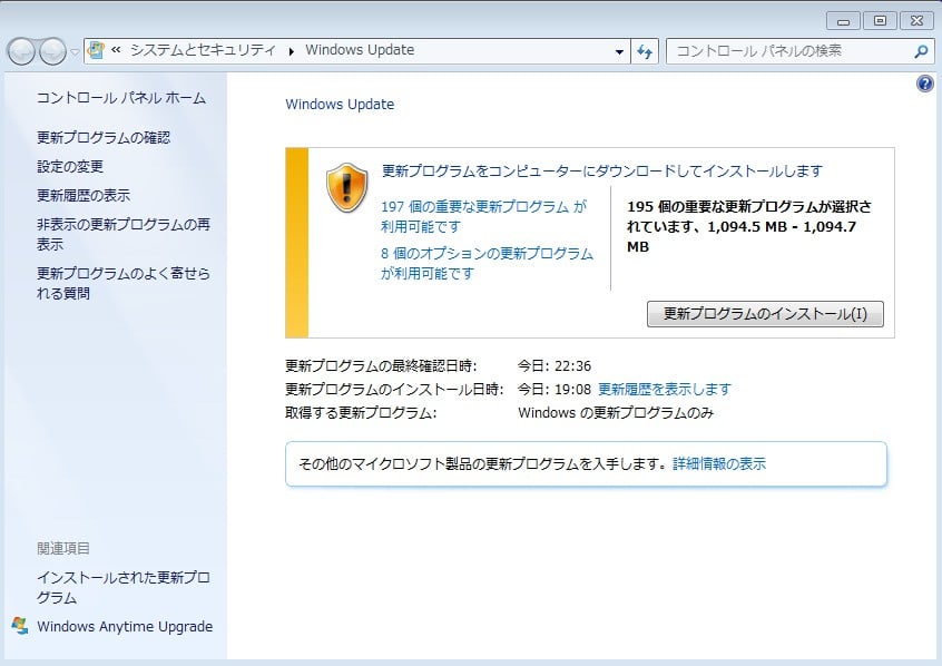 再度、更新プログラムの確認を実行します。いままでは、ここで延々といつまでも更新の確認が終わらない現象が出ていました。ところが現在は、何の対策をしなくても7分で197個の更新プログラムが見つかりました。約2年ぶりに正常に戻りました。