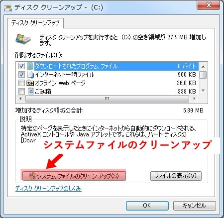 Windows Updateのクリーンアップは、最初のディスククリーンアップ項目には出てこないので、さらにシステムファイルのクリーンアップ のボタンをクリックします。