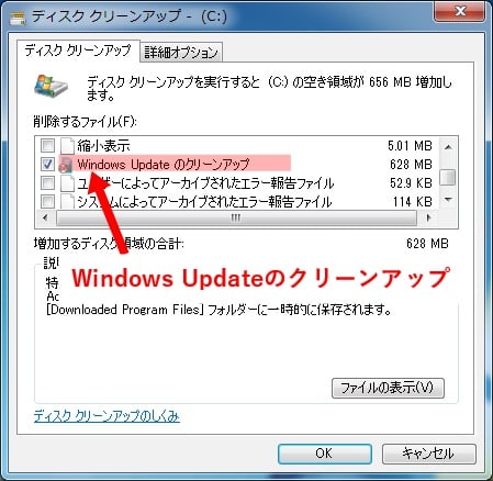 次の画面では、 Windows Update のクリーンアップ の項目が出ているので、チェックを入れて OK を押します。