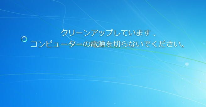 一度電源が切れて、また電源を入れるとまたWindowsを構成するための準備中 の表示からクリーンアップしています。となり、デスクトップが出るまで待ちます。