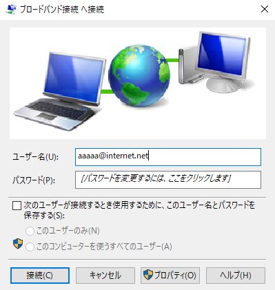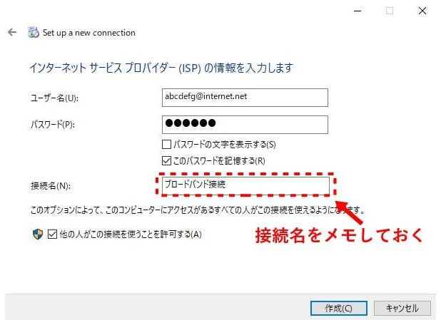 ユーザー名、パスワードはISPから通知されているモノを入力して、 このパスワードを記憶する、 他の人がこの接続を使用することを許可する(複数のWindowsユーザーアカウントがある場合)にチェックを入れます。