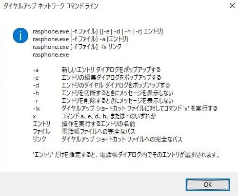 スタートボタンを右クリック→ファイル名を指定して実行 もしくはコマンドプロンプト または Windows PowerShellで rasphone –help と入力すると説明画面が出ます。
