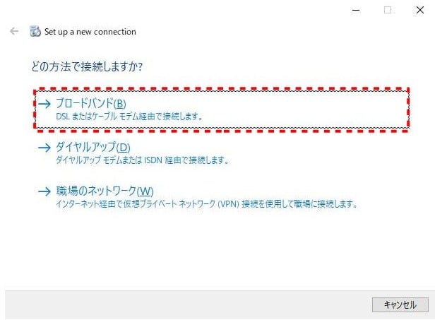 接続名は、デフォルトの「ブロードバンド接続」のままでも良いですし、任意のアルファベットの接続名にしたほうがこのあと設定しやすいです。