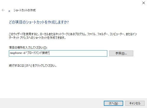 デスクトップの何もないところで右クリック→新規作成→ショートカット を選択します。項目欄に rasphone -d “ブロードバンド接続” と入力します。“ブロードバンド接続”の部分は例ですが、実際に作成した接続名を入力します。
