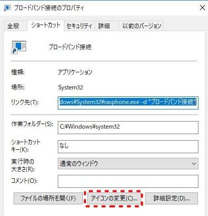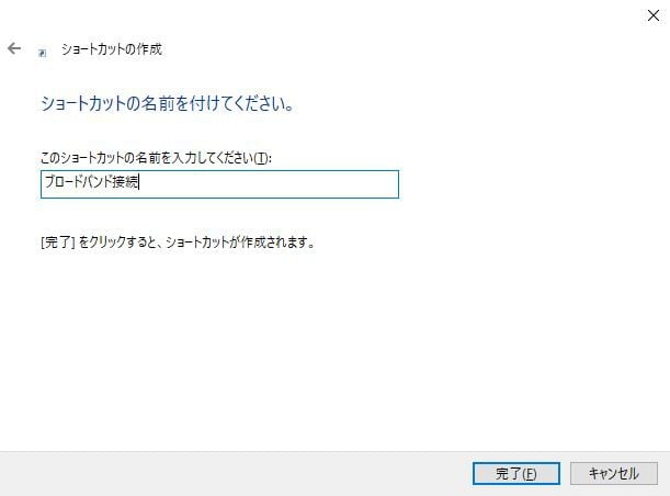 接続画面を出さずに、アイコンをダブルクリックするだけで接続するようにするには、rasdial.exe を使います。ショートカットを作成するコマンドを rasdial “ブロードバンド接続” “ユーザー名” “password” にします。こちらを使ってPC起動時に自動接続する方法は、次回記事にしました。→ PC起動やスリープ解除時に自動でPPPoE接続する設定方法