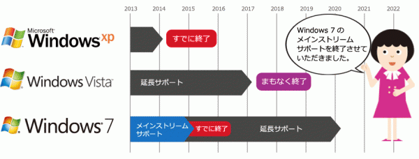 windows7はすでにメインストリームサポート期間が終了して、残り5年の延長サポート期間に突入しています。2020年までの5年を長いと見るか、短いと感じるかは意見が別れるところでしょう。