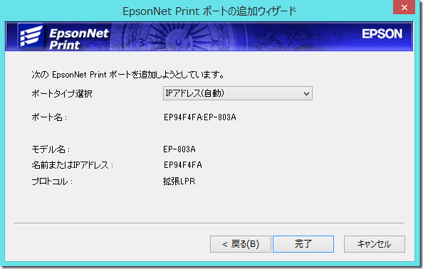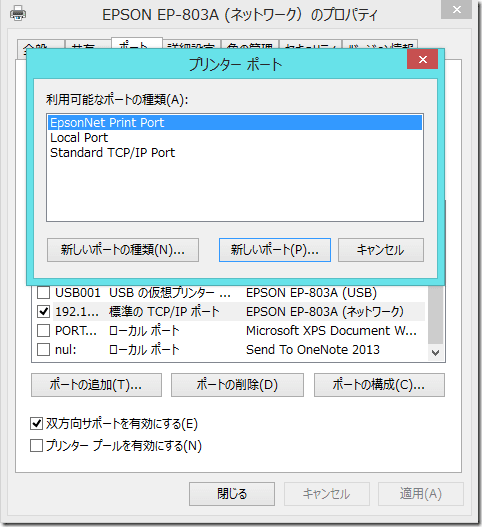 USBでの設定はすんなり完了しました。そのプリンターのプロパティからポート変更で、EpsonNet Printポートに変更してみます。