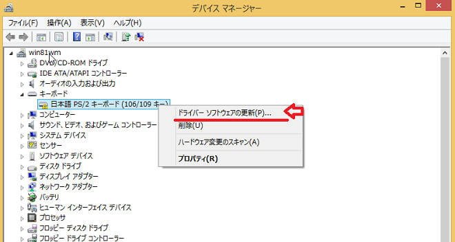 再度デバイスマネージャーを開き、日本語PS/2キーボード(106/109キー)の上で右クリック、ドライバーソフトウェアの更新を左クリックします。