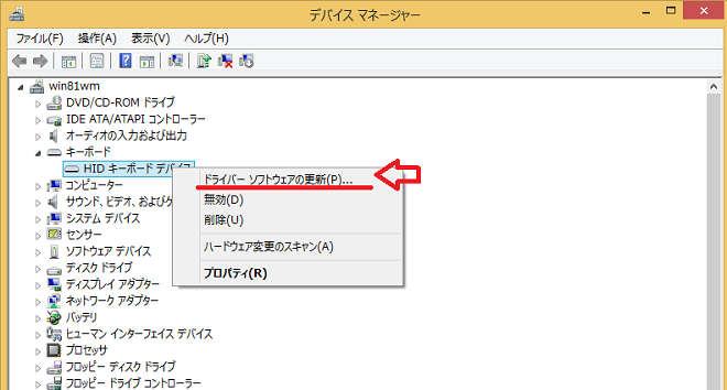 キーボード-HIDキーボードデバイスの上で右クリック、ドライバーソフトウェアの更新を左クリックします。