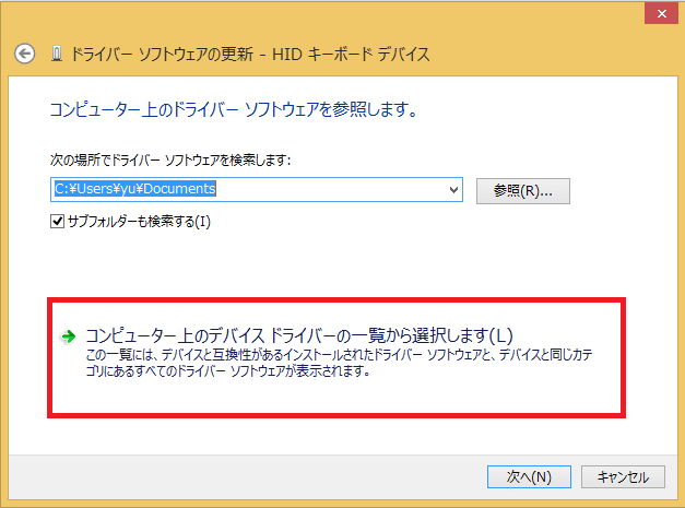 コンピューター上のデバイスドライバーの一覧から選択しますをクリック
