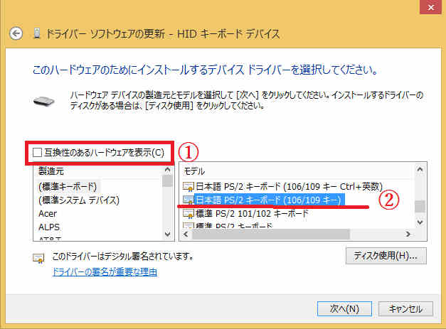 - 日本語PS/2キーボード(106/109キー)を選択して「次へ」をクリック