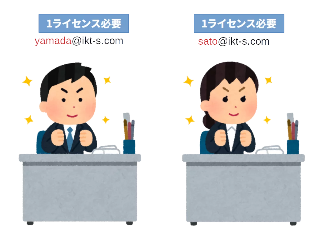 Exchange Onlineのライセンスも1ユーザーのメールアドレスひとつに割り当てられます。同じドメインのメールでもユーザーが違えば追加ライセンスが必要です。社員2人の会社でそれぞれ個別のメールアドレスを使うなら2ライセンスが必要です。新入社員を一人採用したらその人用のメールアドレスに追加ライセンスを割り当てる必要があります。