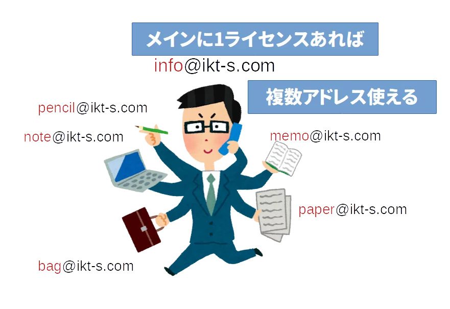 1ユーザーが複数メールアドレスを使う場合は、ライセンスは一つでも複数メールを使うことができます。このあと説明する共有メールボックス機能を使えば、ドメインが同じ複数のメールアドレスを使えます。