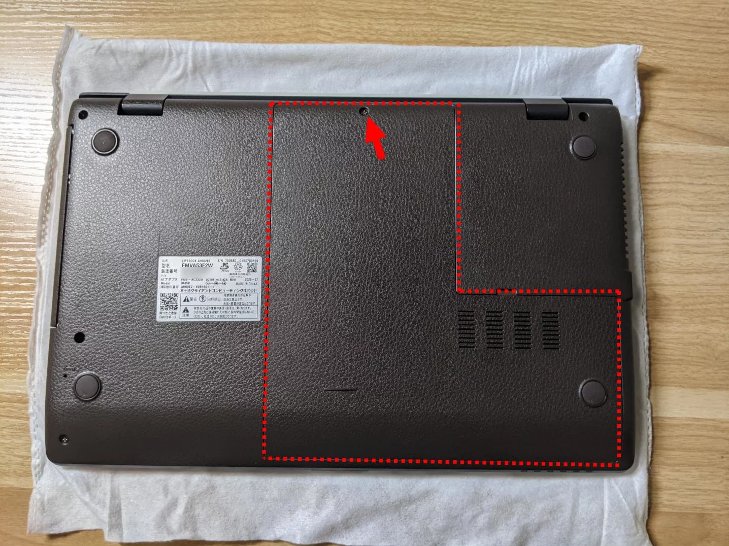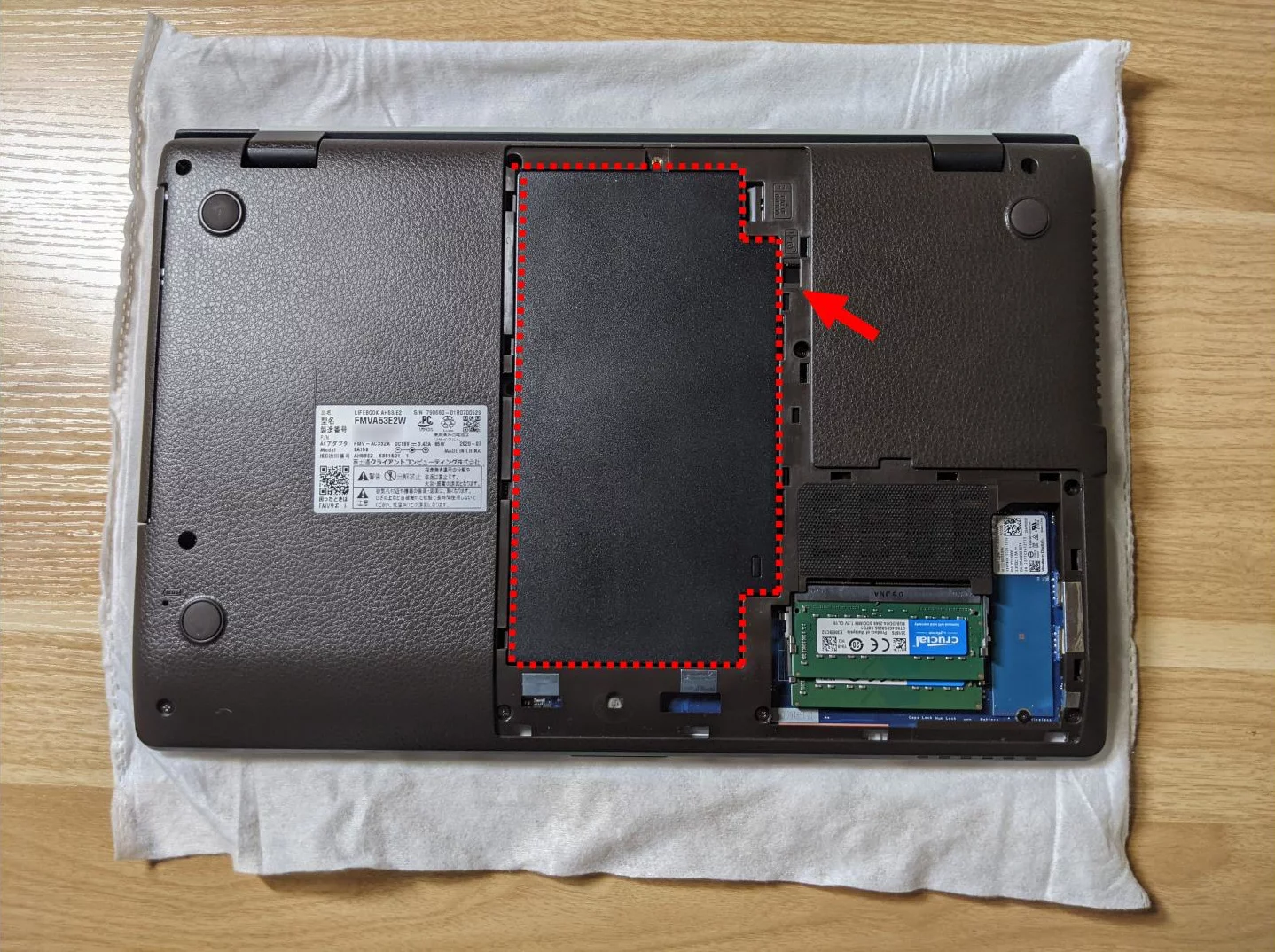 これでメモリーとSSDにアクセスできますが、安全のためバッテリーを外してから作業します。