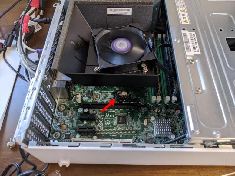 本体のフタをあけて時刻やBIOS設定などを保存しているCMOS電池を外します。数分経ったら元に戻します。
