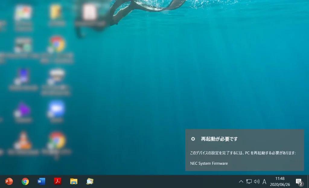 Windowsを使っていたら「再起動が必要です」の通知が出たので再起動したそうです。いつものWindows Updateの更新が入ったときの表示と同じです。NEC System Firmwareドライバーが入ってきたようです。