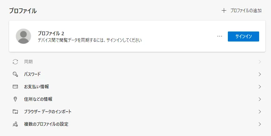 Edgeブラウザーを開いて右上「…」⇒設定⇒プロファイル を開きます。
