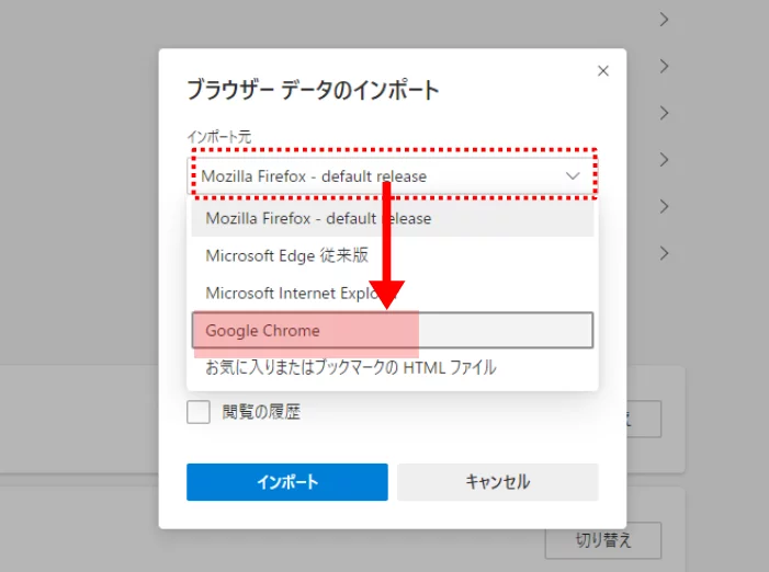 インポート元のプルダウンメニューから「Google Chrome」を選択します。