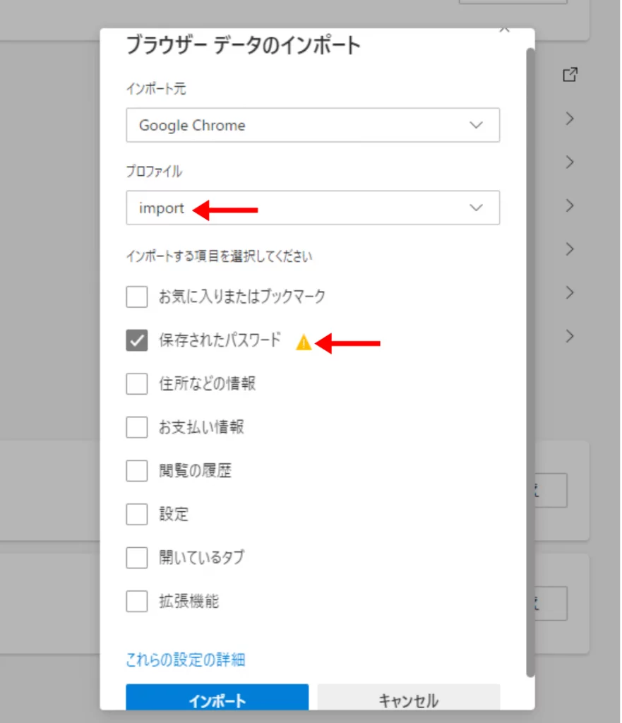 プロファイルのプルダウンメニューからChromeで作業用に作ったプロファイルを選び、「保存されたパスワード」の項目だけにチェックを入れてインポートを実行します。