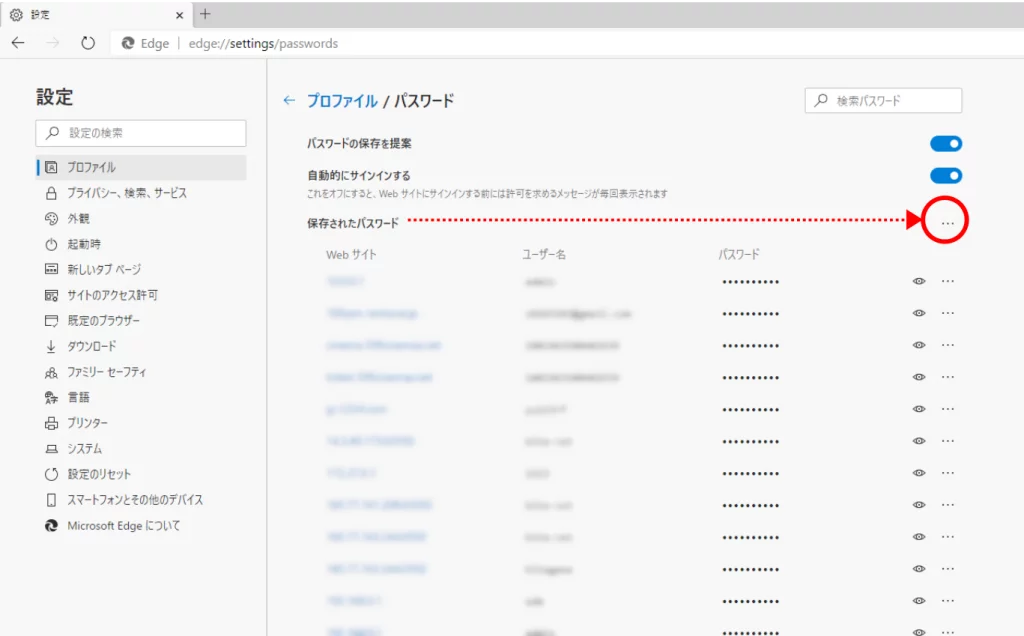 Edgeブラウザーを開いて右上「…」⇒設定⇒プロファイル⇒パスワード を開きます。