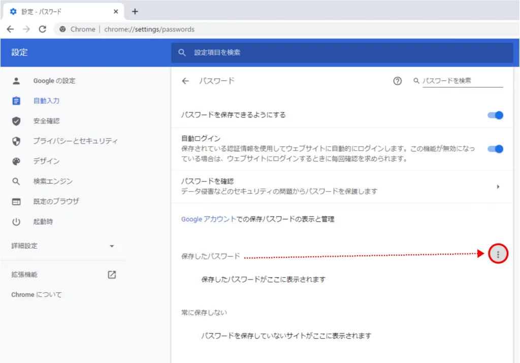 ちょっと場所が分かりにくいですが、保存されたパスワードの文字の右横にある「…」をクリックします。その下に並んでいる各パスワードの「…」ではありません。