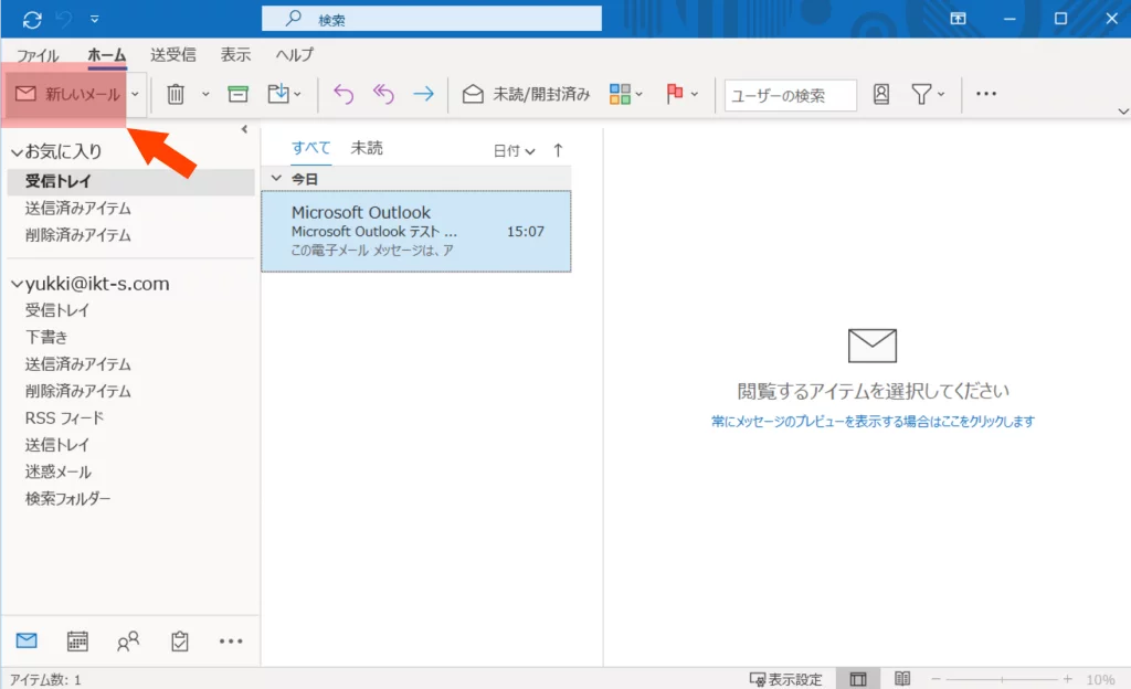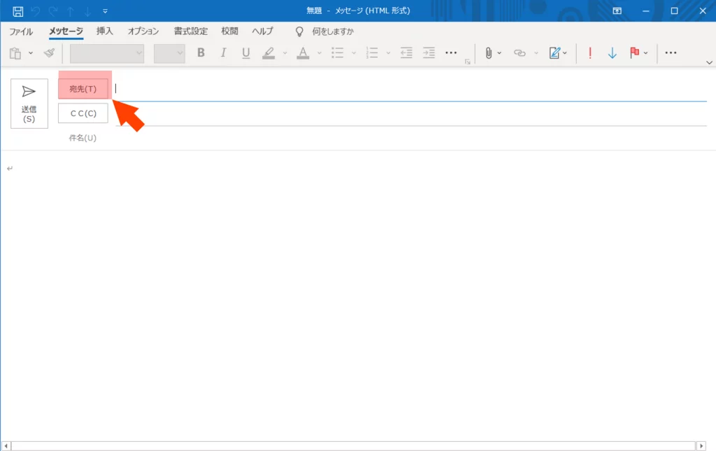 Outookを開き「新しいメール」作成画面を出します。