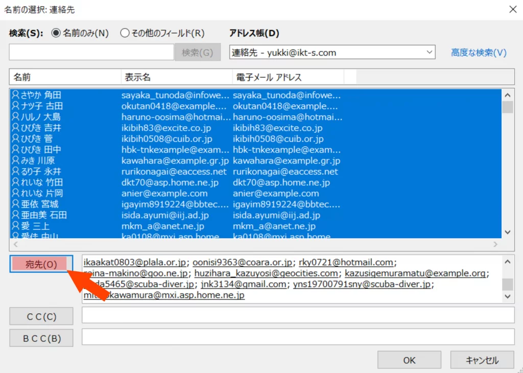 「宛先」ボタンを押してアドレス全件を宛先に追加して「OK」ボタンを押して閉じます。