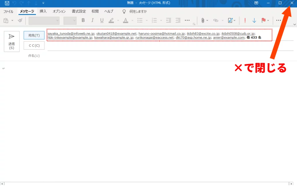 宛先にメールアドレスが全件入っている状態を確認したら、右上×(バツ)でメール作成画面を閉じます。