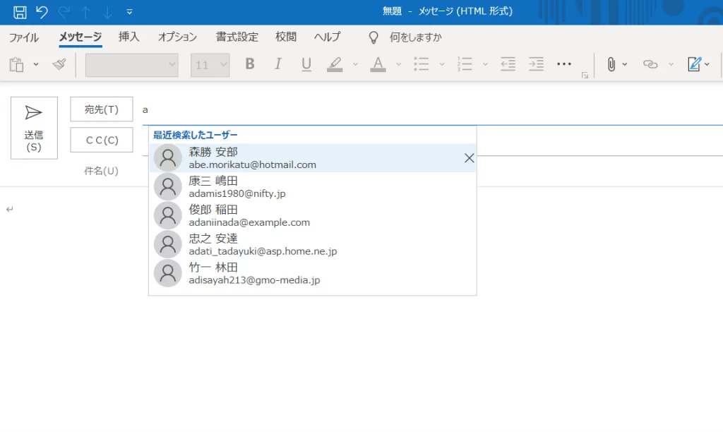 メールアドレスの頭文字のアルファベットだけじゃなく、名前の頭文字の漢字でオートコンプリートさせたいところです。これは、連絡先をインポートする際に一工夫が必要です。